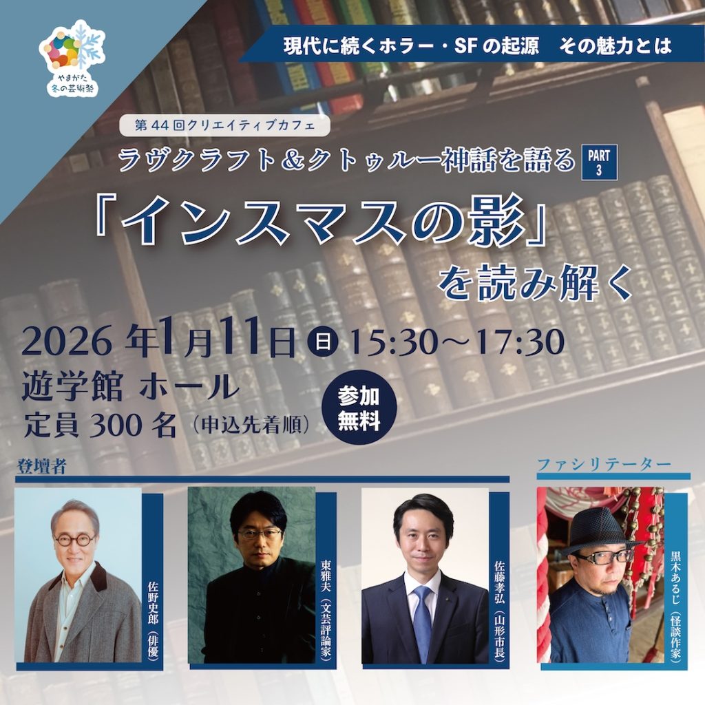 高校生の頃からラヴクラフト作品を愛読している山形市長・佐藤孝弘が、ラヴクラフトの専門家等をゲストに迎え、その魅力を語り合う大好評トークイベントの第3弾。