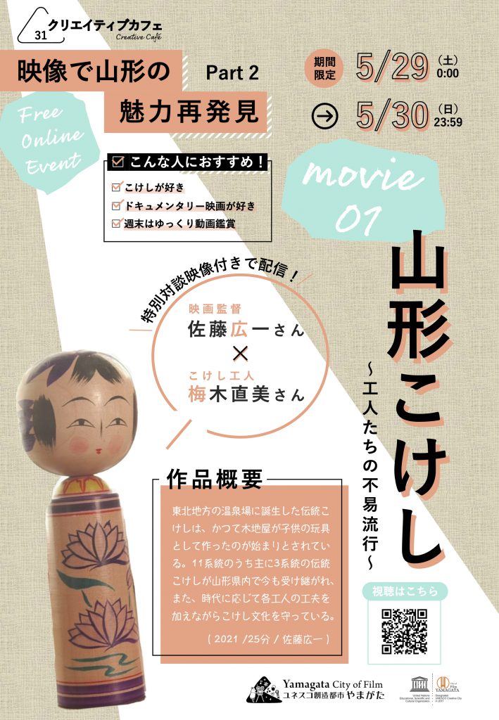 皆さまの声にお応えして、3月に行われた第30回クリエイティブカフェ「映像で山形の魅力再発見」にて、2日間限定でお披露目オンライン上映を行った最新短編ドキュメンタリー作品を、再上映します!今回配信するのは、東北6県にしかない伝統こけしなどを有する山形のこけし文化に着目した『山形こけし〜工人たちの不易流行〜』。特別映像として、当作品の佐藤広一監督(『世界一と言われた映画館』)と山形市で活躍するこけし工人の梅木直美さんの対談を合わせてお送りします。ぜひご覧ください。