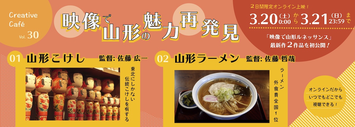 「映像で山形ルネッサンス」は、映像を通して山形の文化と魅力を見直すと同時に、地元映像クリエイターを支援するプロジェクトです。東北にしかない伝統こけしなどを有する「こけし」文化、そしてラーメン外食費全国1位の「ラーメン」文化に着目し、それぞれ短編映画を制作しました。