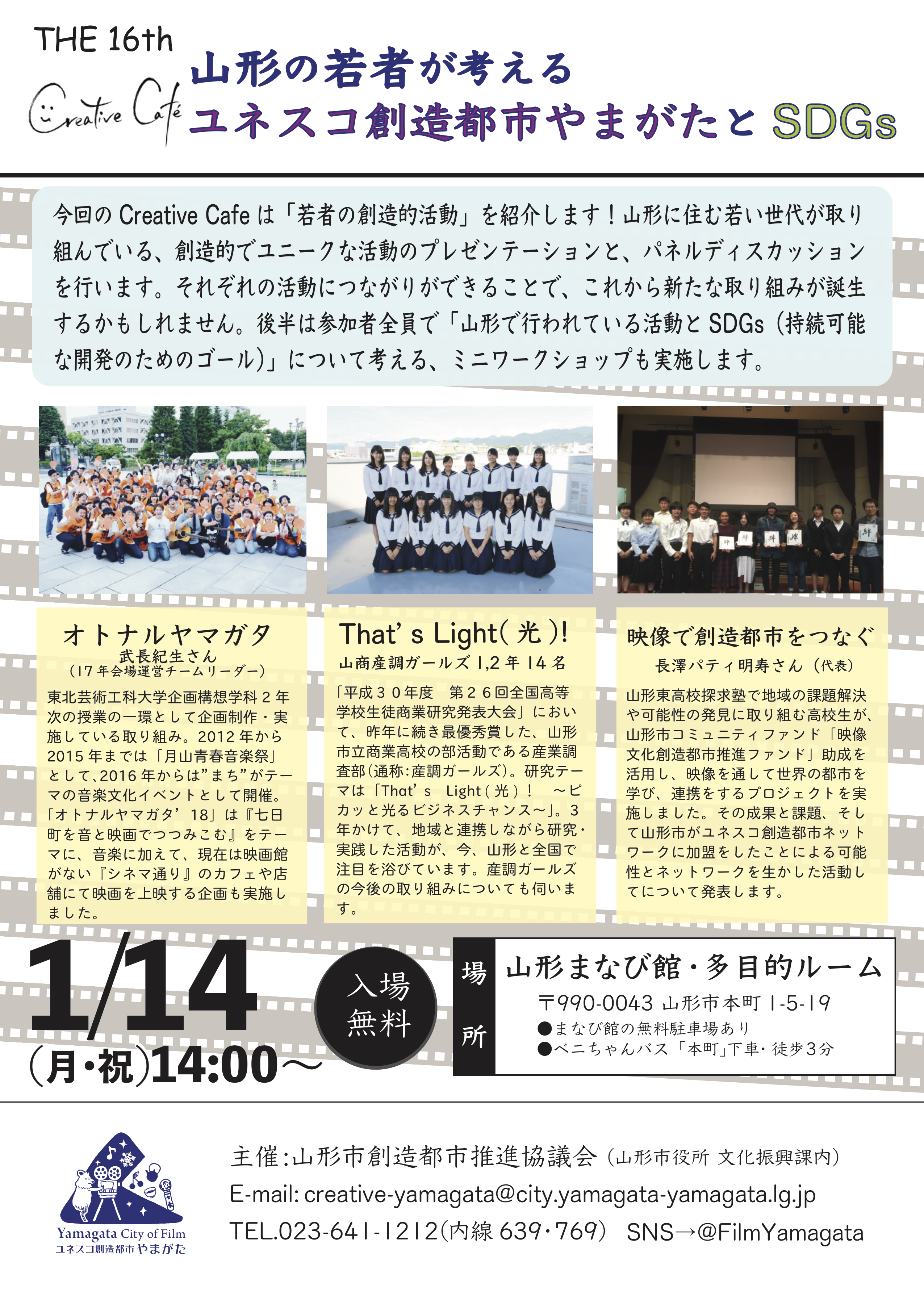 The 16th Creative Café “Young generations, Yamagata City of Film, and SDGs” will be held on Monday, 14 January 2018