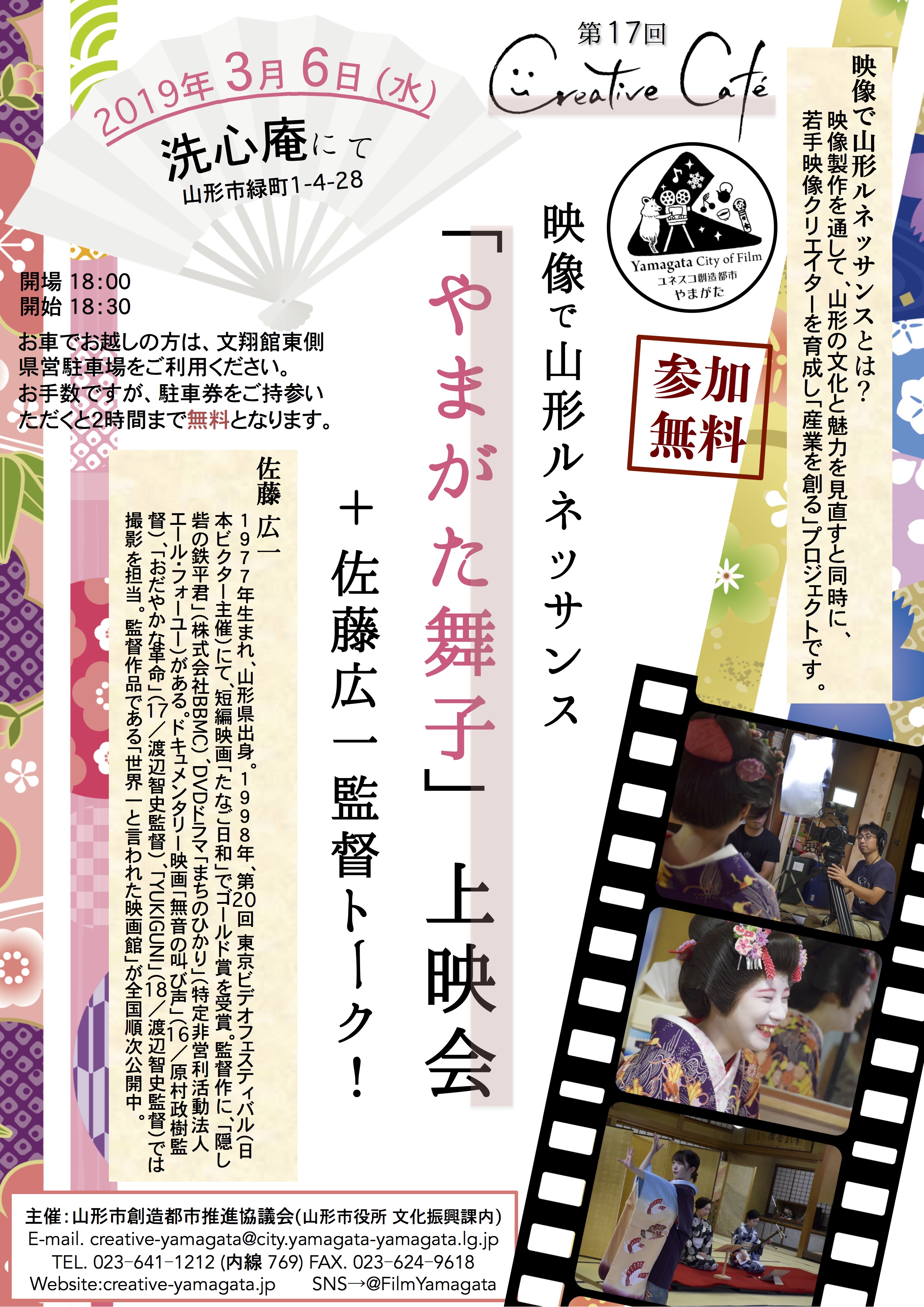 The 17th Creative Café “Yamagata Renaissance Project ‘Yamagata Maiko’ Screening & Director Talk!” will be held on Wednesday, 6 March 2019